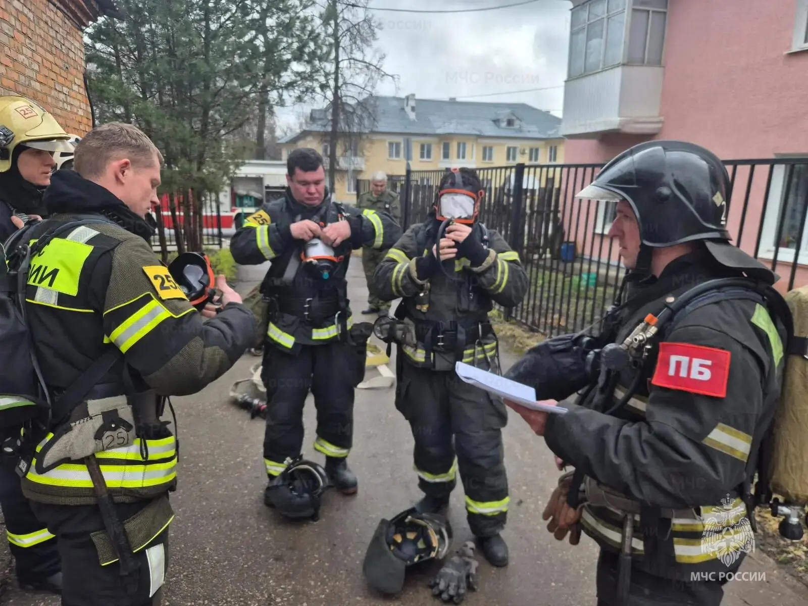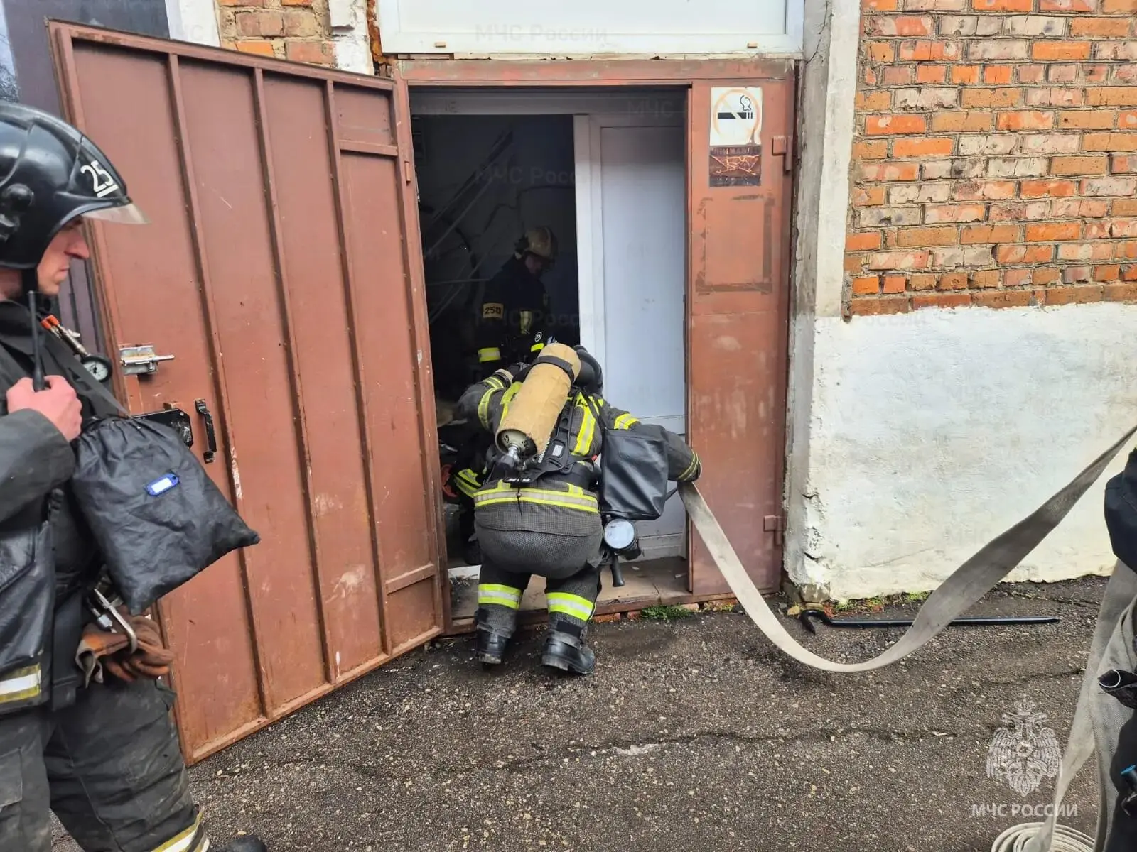 Первое пожарное подразделение прибыло к месту условного пожара спустя несколько минут. Огнеборцы провели разведку в аппаратах для защиты органов дыхания в составе звена газодымозащитной службы по поиску пострадавших. Проведя разведку помещения, спасатели обнаружили двух условно пострадавших, которых с помощью спасательного устройства вывели из здания на свежий воздух. После этого бойцы пожарной охраны оперативно обнаружили и потушили "пожар".