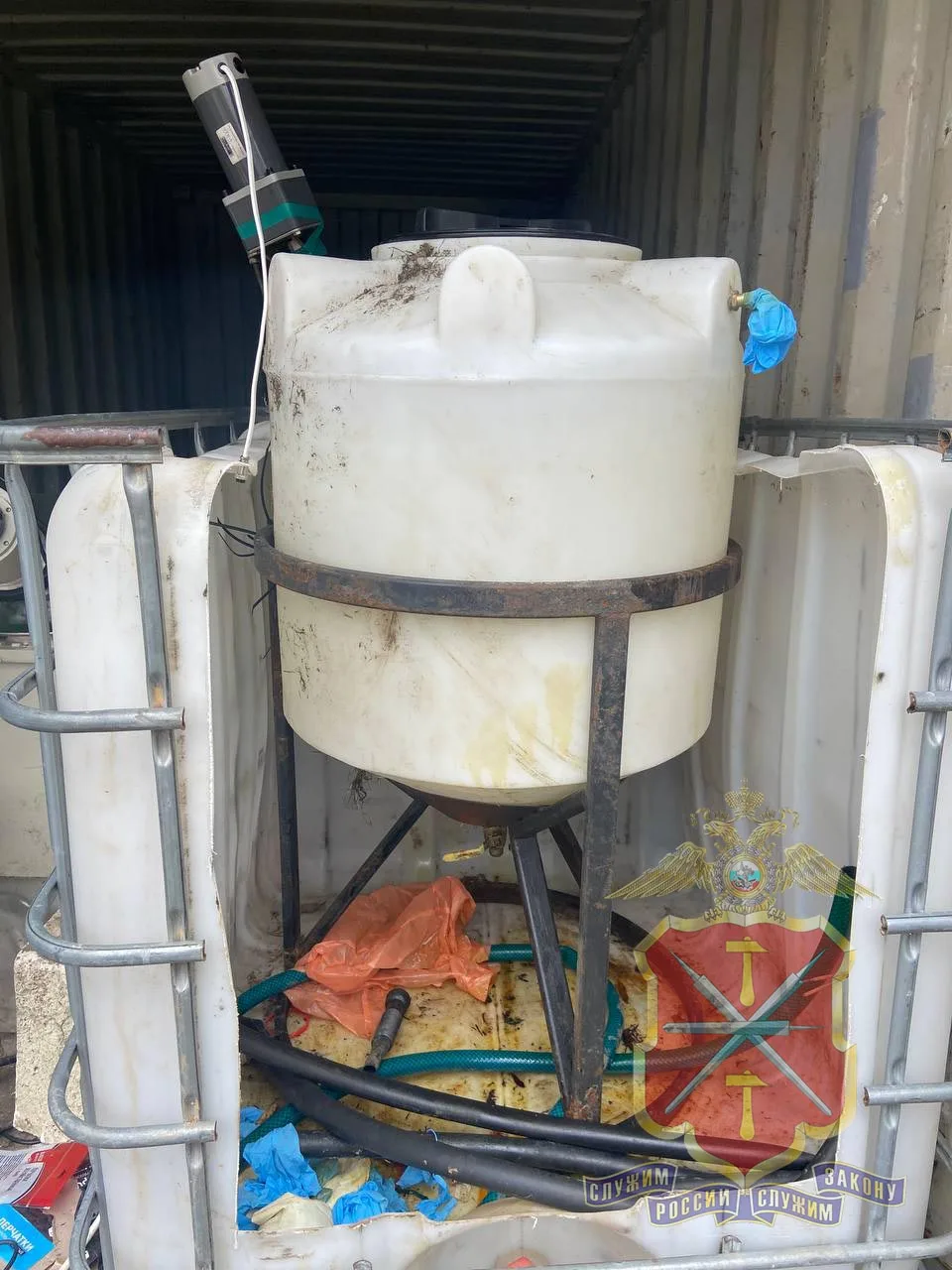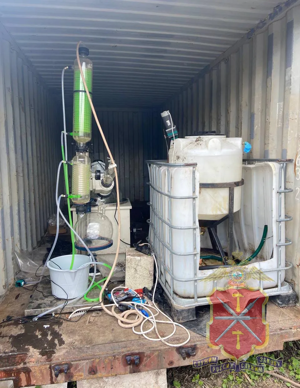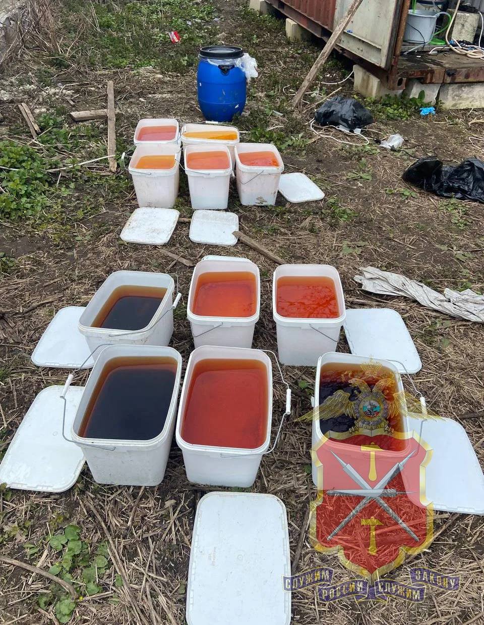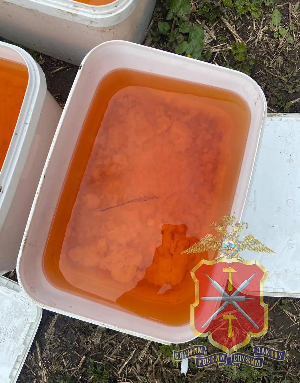 Всего полицейскими были изъяты одна полимерная бочка, 11 пластиковых контейнеров, 2 ведра и 9 канистр, наполненных субстанциями различной консистенции. По предварительным оценкам, их общая масса может составлять порядка 100 килограммов. В настоящее время всё изъятое направлено на химическое исследование.