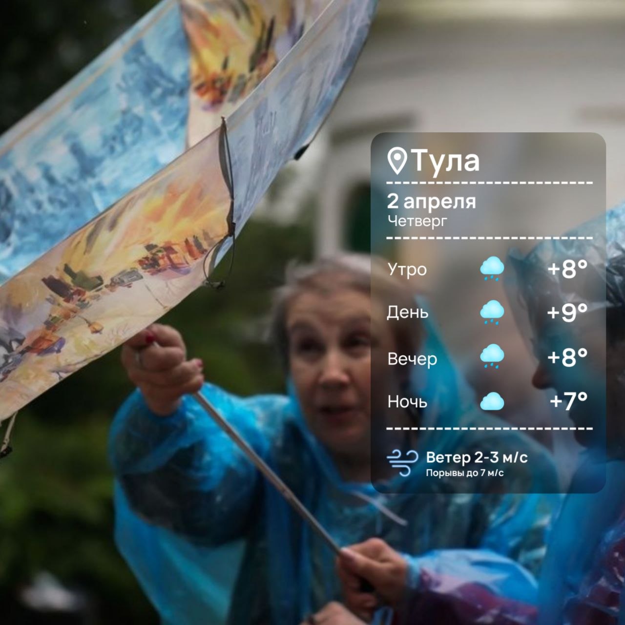 Погода на 2 апреля Время рассвета: 06:00.Время заката: 19:05.Световой день: 13 ч. 5 мин.Температура воздуха: +9°С (днем), +7°C (ночью).Облачно, утром и днём ожидается дождь.Геомагнитная обстановка: слабая буря.ТСН24 | Прислать Новость | Мы в МАХ