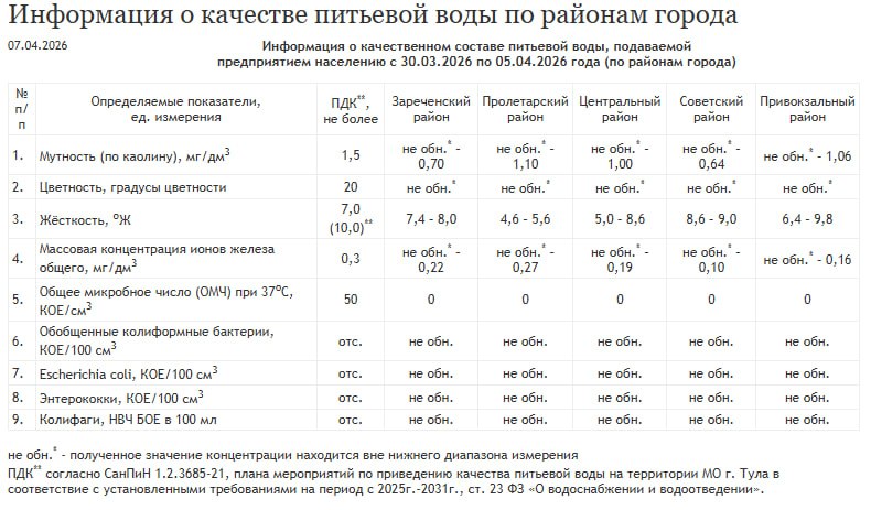 С 30 марта по 5 апреля 2026 года максимальная жесткость воды зарегистрирована в Привокзальном и Советском округах Тулы, а максимальная мягкость — в Пролетарском.