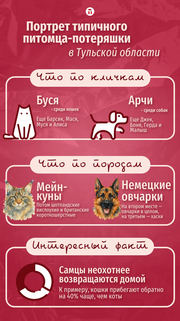 Каждый год платформа Pet911.ru и сервис Kaspersky PetKa готовят отчет о пропавших и найденных питомцах по стране. «Тульская пресса» решила узнать у специалистов портрет типичного животного-потеряшки в нашем регионе.