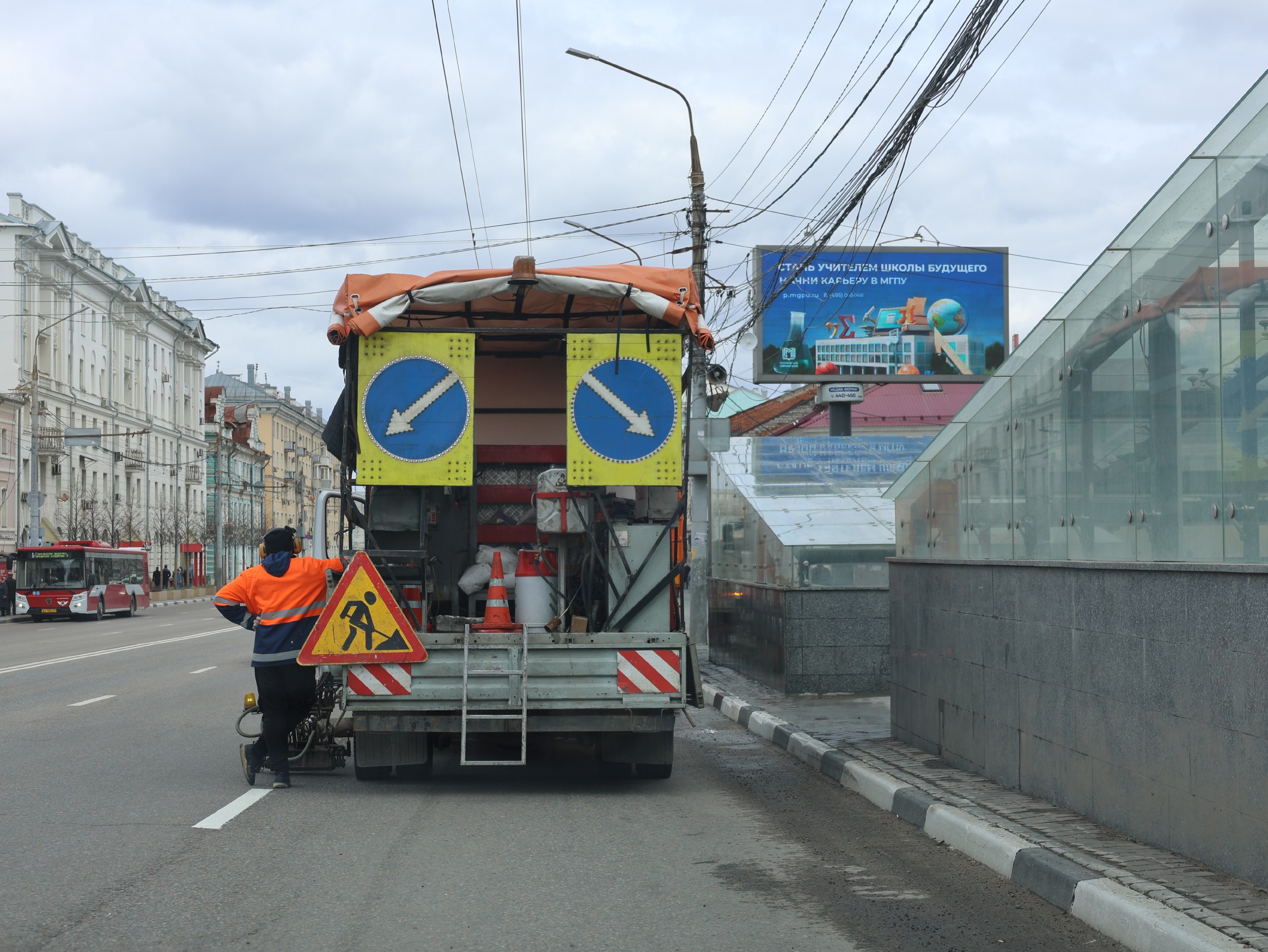 В настоящее время подрядная организация обновила продольную дорожную разметку на улицах Советской, Менделеевской, Союзной, Благовещенской, Дзержинского и Никитской, на участке от ул. Менделеевской до ул. Советской по ул. Тургеневской, на участке от ул. Советской до ул. Менделеевской по ул. Революции, в Садовом и Благовещенском переулках, на Чапаевском проезде, пешеходных переходах на ул. Менделеевской.