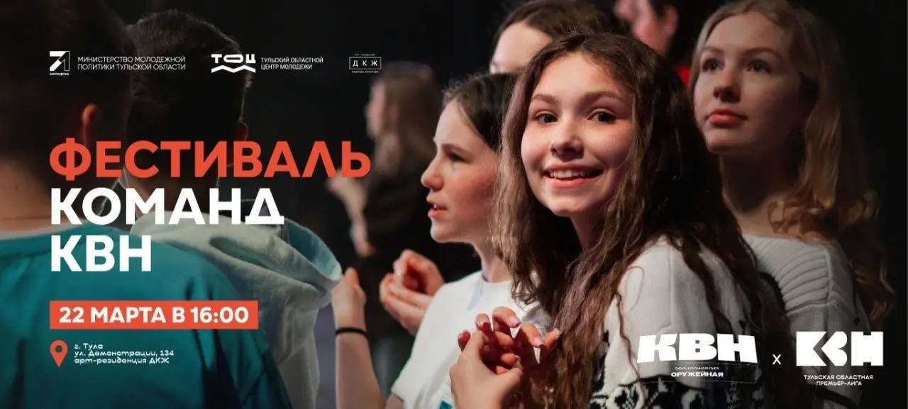 22 марта в Арт-резиденции «ДКЖ» пройдет первый совместный Фестиваль Тульской областной Премьер-лиги КВН и Официальной Оружейной лиги КВН. На одной сцене выступят команды из Тульской области и других регионов страны.