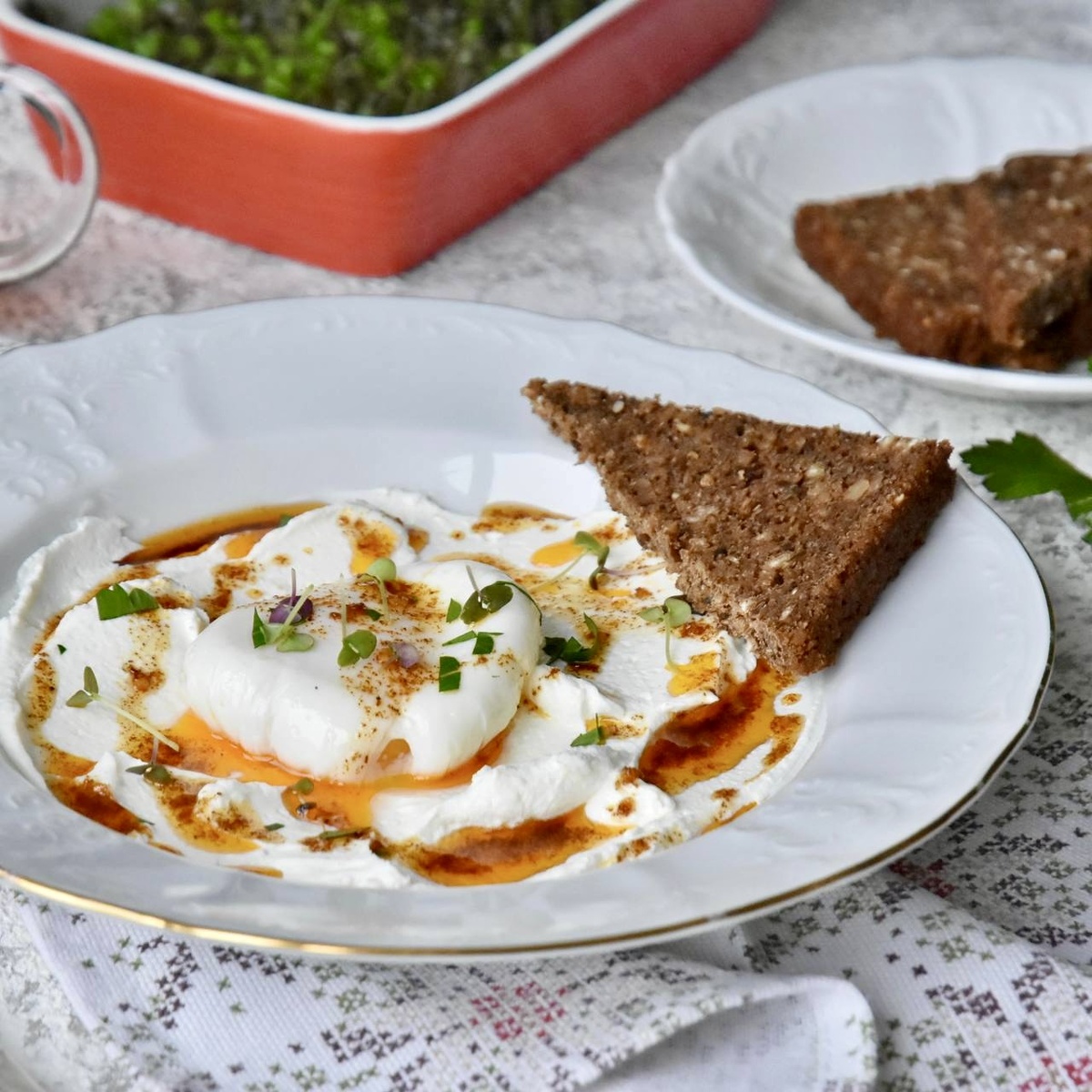 7. Теперь все готово для сервировки. На тарелку выложите йогуртовую массу, сверху положите яйцо пашот, добавьте рубленую зелень и полейте ароматным маслом.