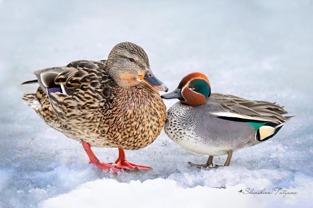 В Центральном парке Белоусова замечена необычная парочка: самый маленький селезень России — чирок-свистунок — прилетел на пруд и влюбился в местную крякву. Птицы теперь неразлучны.