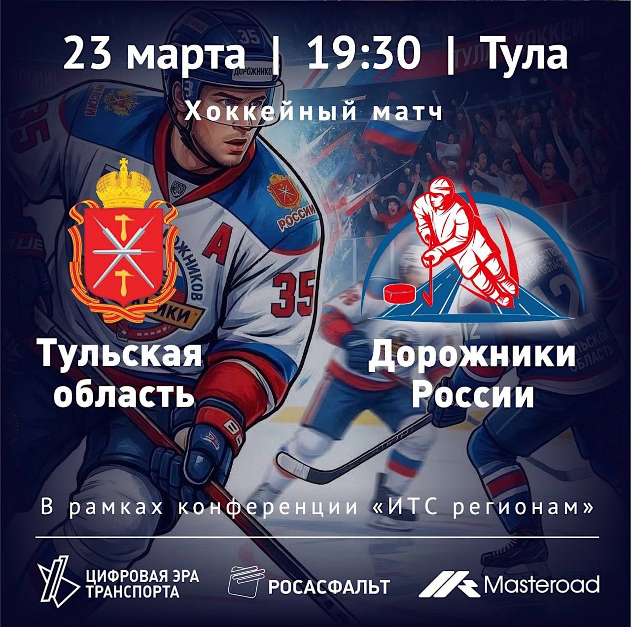 23 марта в рамках конференции и выставки «ИТС регионам» в г. Тула на Ледовой арене состоится товарищеский хоккейный матч между Правительством Тульской области и Сборной Дорожников России.