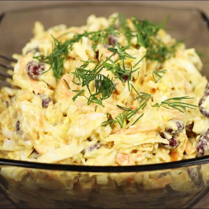 Следующий шаг — добавьте в салат консервированную фасоль или кукурузу, по вашему выбору. Приправьте массу солью и перцем, а затем дополните майонезом. Хорошо перемешайте все ингредиенты, чтобы они равномерно распределились.