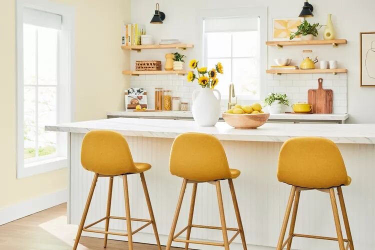 Дизайнеры всё чаще отходят от традиционных схем. Например, остров, оформленный узорчатыми обоями, может стать центром притяжения. Комплект желтых барных стульев добавит контраста и оживит атмосферу. Но не забывайте о важности баланса: горчично-желтые детали в сочетании с нежно-розовыми акцентами и натуральными материалами создадут уют и свежесть.