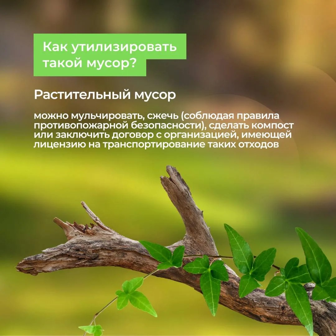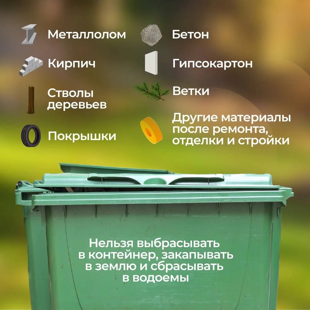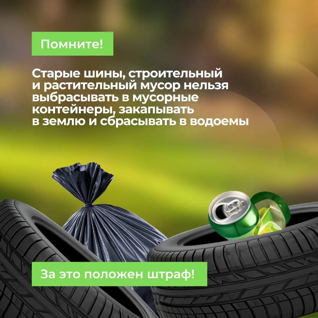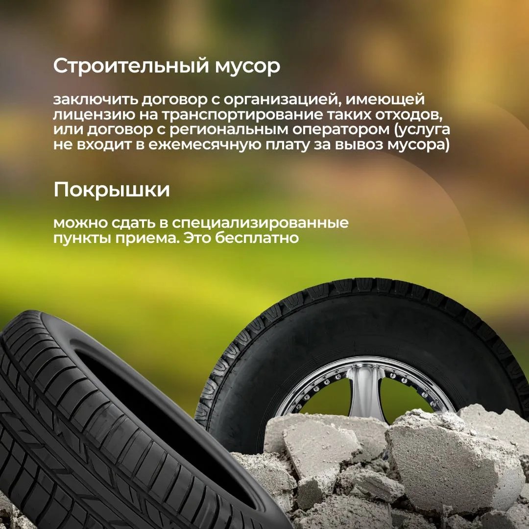 Строительные, растительные отходы и покрышки нельзя выбрасывать в мусорные контейнеры или оставлять в безлюдных местах.