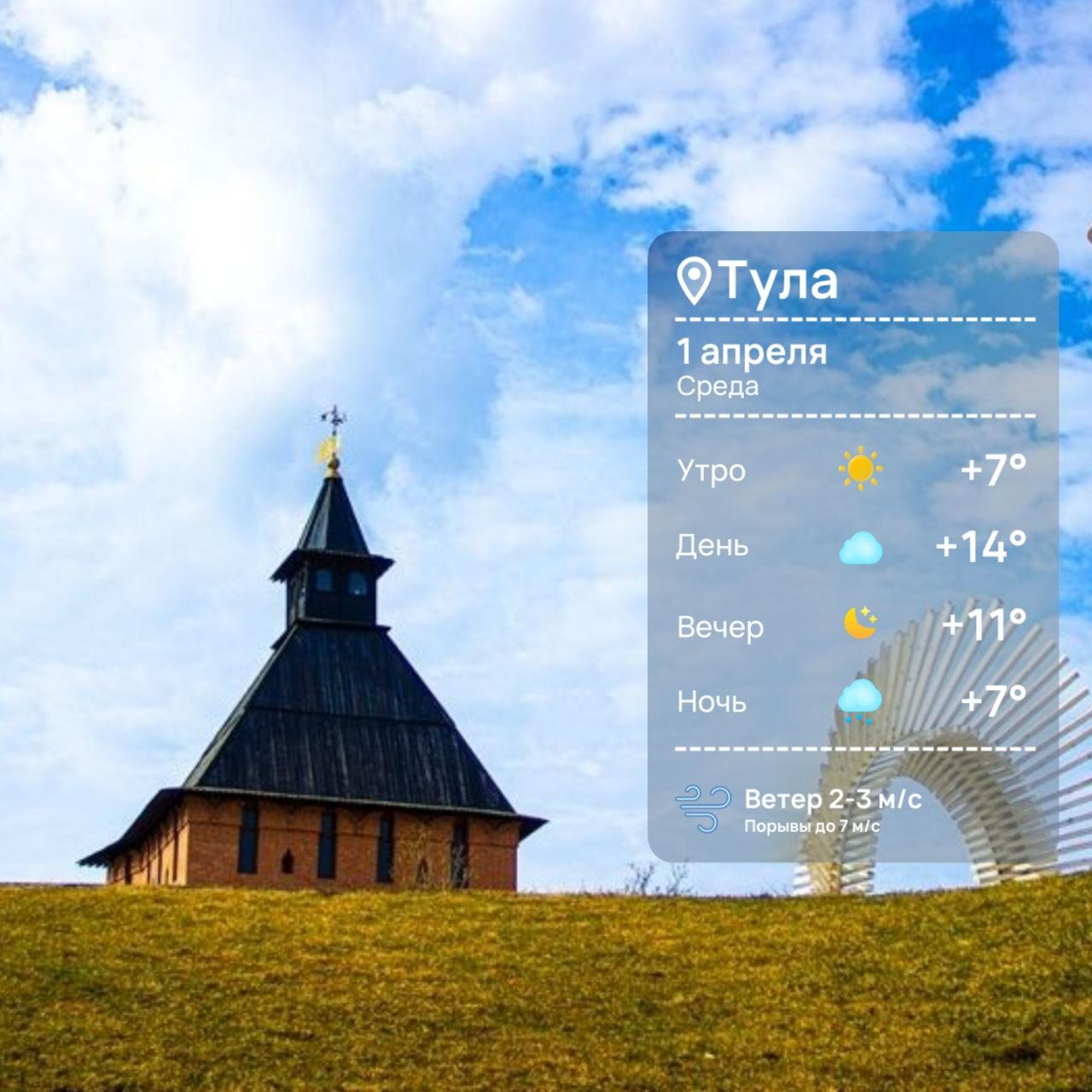 Погода на 1 апреля Время рассвета: 06:02.Время заката: 19:04.Световой день: 13 ч. 2 мин.Температура воздуха: +15°С (днем), +9°C (ночью).Облачно, ближе к ночи ожидается дождь.Геомагнитная обстановка: умеренная буря.ТСН24 | Прислать Новость | Мы в МАХ
