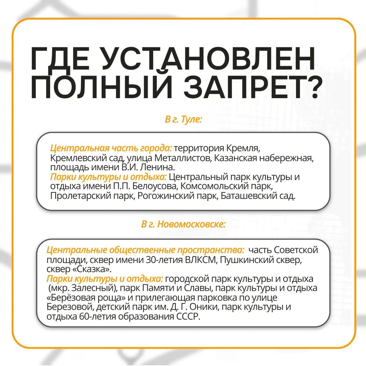 Полный запрет на движение введён в тульском кремле, центральных парках, на Казанской набережной, а также в ряде скверов и парков Новомосковска.