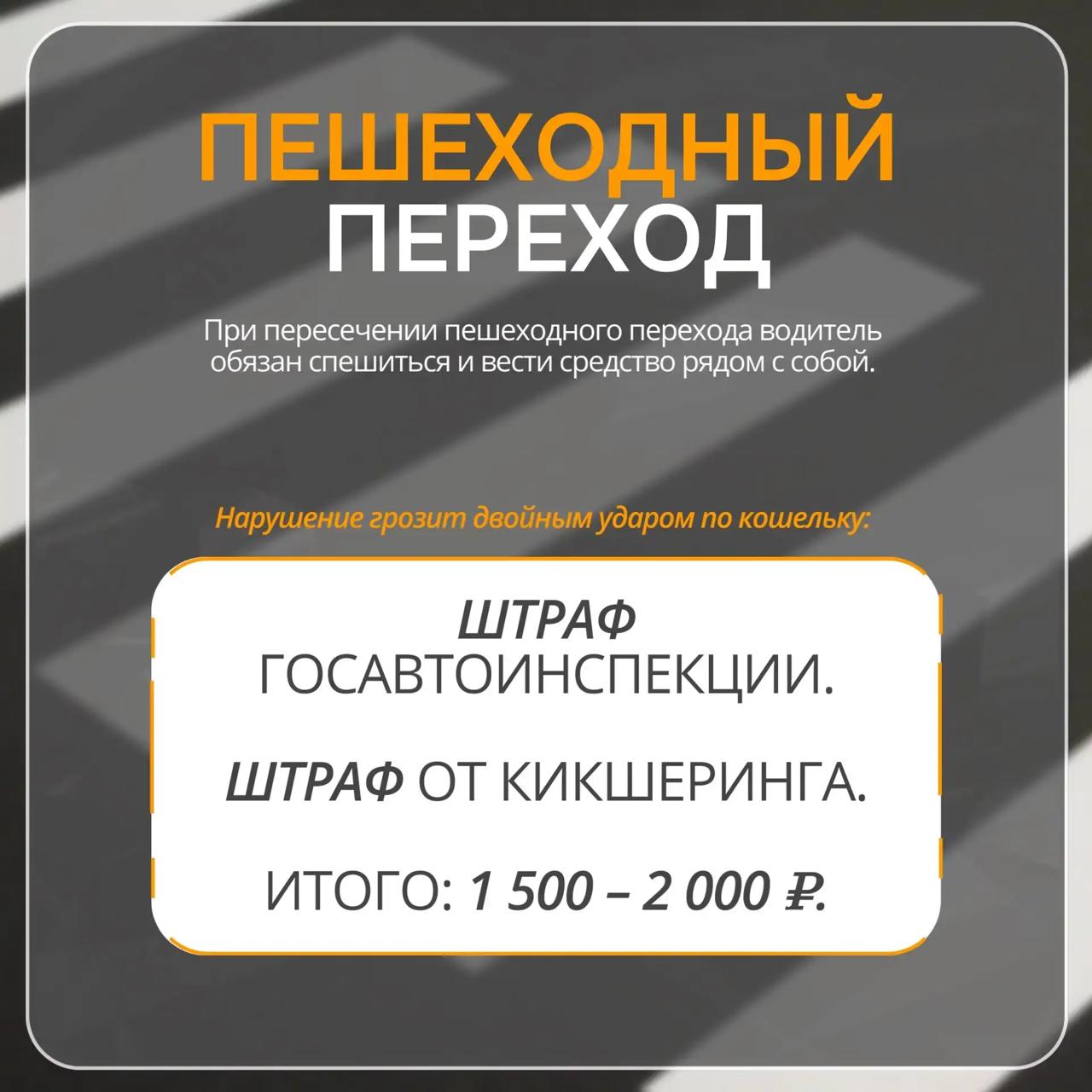 На пешеходных переходах обязательно спешиваться. За нарушение — штраф от ГИБДД и кикшеринга: итого 1500–2000 рублей.