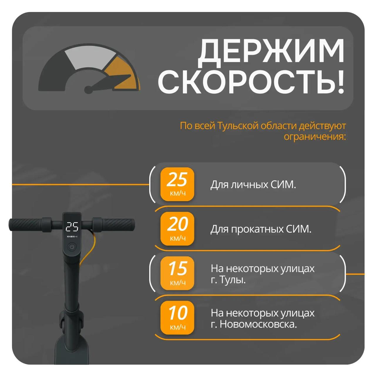 для личных СИМ — 25 км/ч, для прокатных — 20 км/ч. В Туле на некоторых улицах — 15 км/ч, в Новомосковске — 10 км/ч.