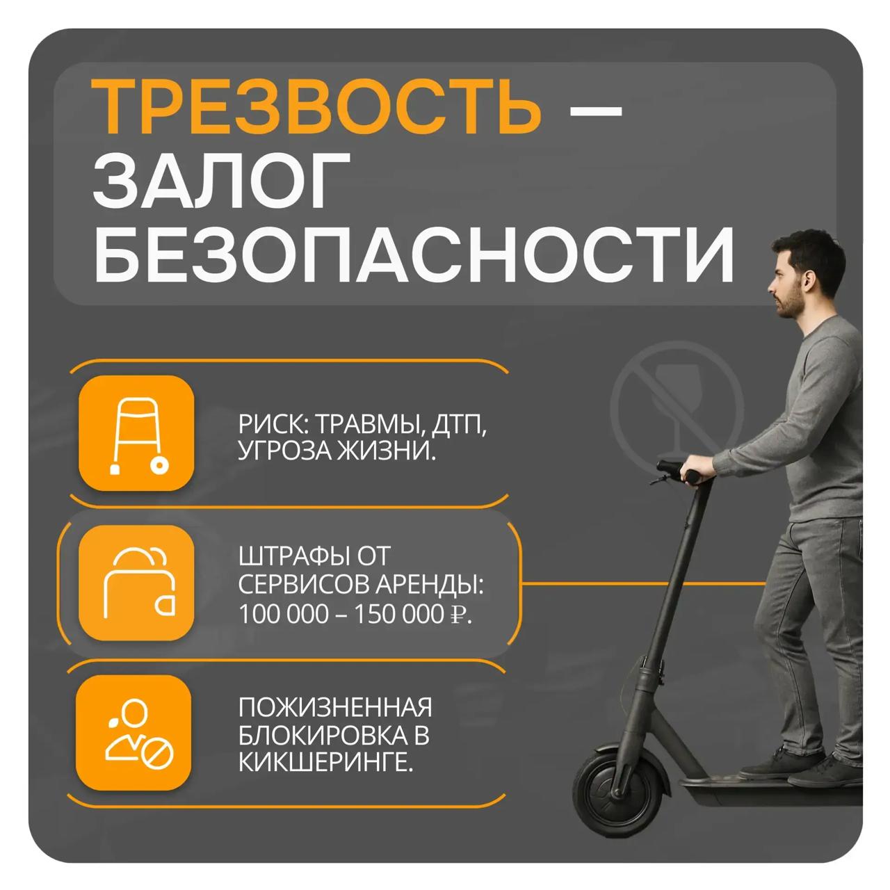 Поездка в нетрезвом виде — риск для жизни и здоровья. Штрафы от сервисов аренды достигают 150 000 рублей с пожизненной блокировкой.