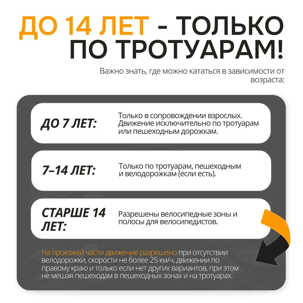 Дети до 14 лет могут кататься только по тротуарам и пешеходным дорожкам. До 7 лет — исключительно в сопровождении взрослых.