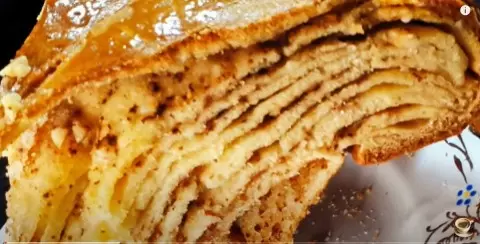 Соберите пирог, укладывая слои друг на друга. Затем поместите подготовленный шедевр в кондитерскую форму или просто на противень, предварительно смазанный растительным маслом. Для придания аппетитного вида поверхность можно смазать взбитым яйцом.