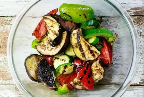 Приготовление: очистите и нарежьте овощи. Перец следует разобрать на крупные части, кабачок и баклажан — нарезать кружочками величиной около 5 мм. Обваляйте подготовленные овощи в масле, посолите и приправьте паприкой, обжарьте их на гриль-сковороде до полной готовности. После этого нарежьте их кубиками или оставьте в крупных кусках.