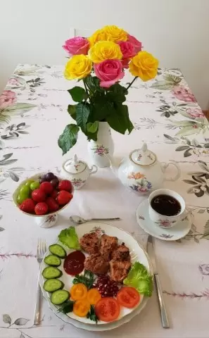 Во время того, как мясо будет дожидаться, можно заняться сервировкой стола — нарезать свежие огурцы, помидоры и перец, а также подготовить фрукты для десерта.