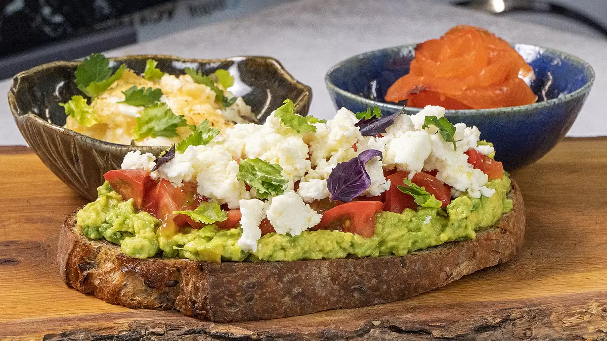 Третья закуска — это аппетитные бутерброды с авокадо. Половину авокадо нужно размять с помощью вилки, добавить немного соли и несколько капель лимонного сока для свежести. Адыгейский сыр нарезается на небольшие кусочки и сбрызгивается оливковым маслом. На предварительно обжаренный на сливочном масле ломтик хлеба сначала выкладывается паста из авокадо, потом порезанные томаты и сыр. Украшая всё это зеленью, выставляют на стол — такой завтрак произведет впечатление!