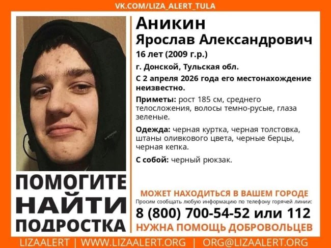 Следственный комитет возбудил уголовное дело по факту исчезновения 16-летнего Ярослава Аникина из города Донской. Со 2 апреля о нём нет вестей.