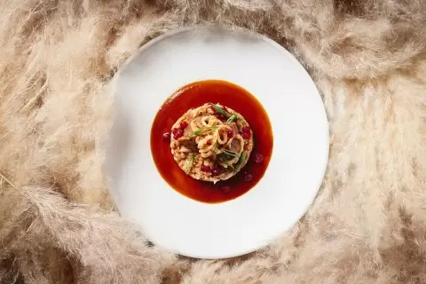 Блюдо сочетает в себе простоту деревенской кухни и гастрономическую изысканность: полба придаёт текстуре богатство, а томлёный ягнёнок — глубину вкуса. Подавать горячим, с бокалом лёгкого красного вина или травяного настоя.