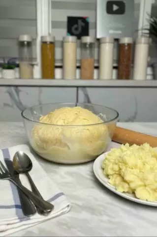 2. Для начинки: отварить картофель до готовности, сделать пюре, добавить сливочное масло и горячее молоко, нарезанный лук обжарить. Соединить эти компоненты. Начинка готова!