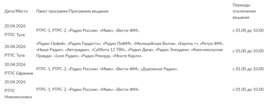 Вещание ТВ и радио приостановят 20 апреля в Тульской области