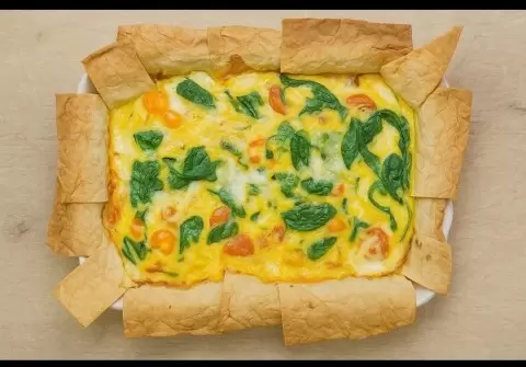 Шпинат используется молодой, с нежными листьями; большие листья удобно нарезать. После этого следует приступить к формированию завтрака, выкладывая полоски лаваша на дно формы для запекания. Вылить яйца, добавить творожное зерно и аккуратно перемешать. Затем добавить шпинат и красиво выложить помидоры, создавая оригинальный вид.