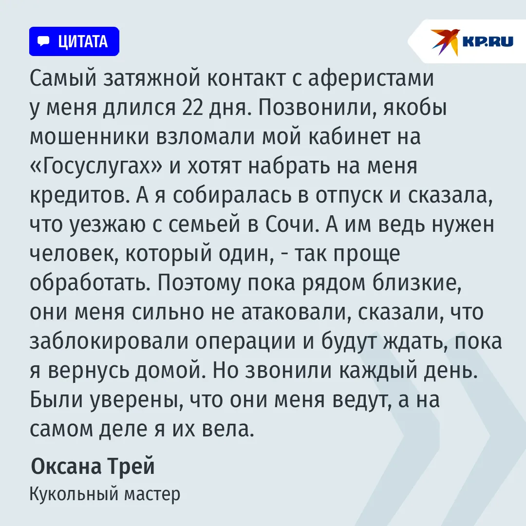 В обычной жизни Оксана Трей – кукольный мастер. Это и хобби, и заработок. Но в последние пару лет главным делом для женщины стала охота на телефонных мошенников. Практически каждый день она берет телефон, включает программу-"рулетку", притягивающую нежелательные звонки, и, имитируя голос пожилой женщины, отвечает: "Алло…"