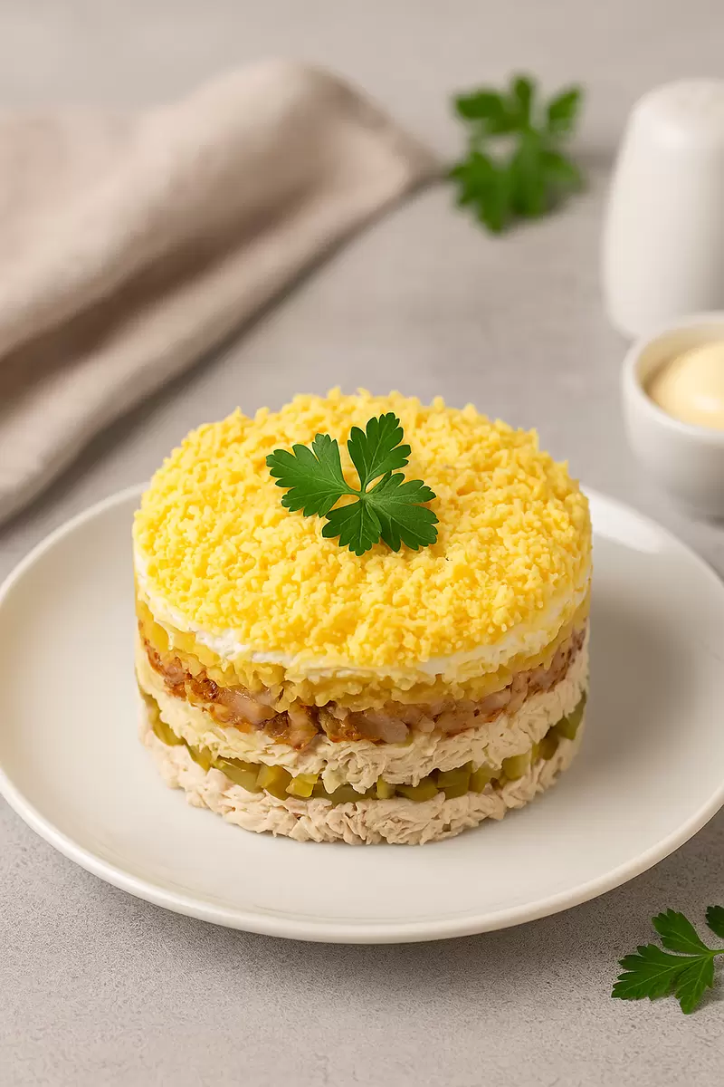 Украсить блюдо можно рубленой зеленью, узором из майонеза или же натертым желтком. Такой подход придаст блюду воздушный вид и украсит ваш стол. Альтернативные варианты включают использование копченого мяса для более насыщенного вкуса или добавление орехов для интересной текстуры.