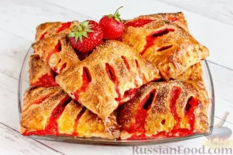 - Слойки с клубникой – простое в приготовлении лакомство, которое можно создать из готового теста. Всего лишь немного нарезанной свежей клубники и за несколько минут на вашем столе появится ароматная выпечка.