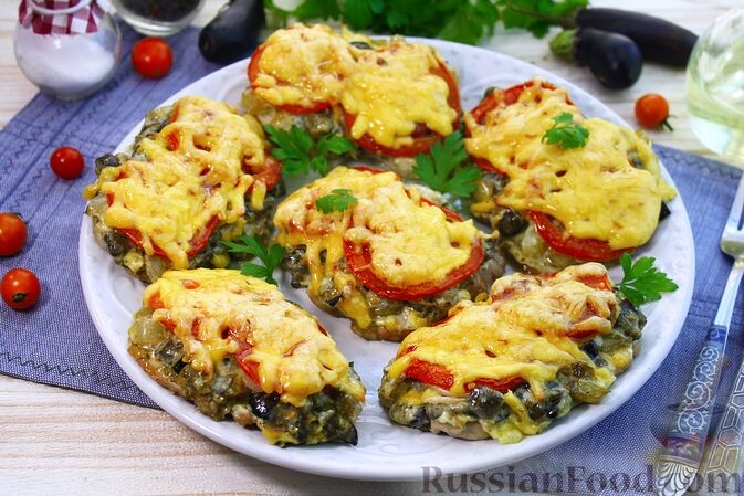 - Свиные отбивные с овощами: Нежные отбивные запекаются под аппетитной шубкой из баклажанов и сладкого перца. Добавление помидоров и сыра придает блюду насыщенный вкус, создавая идеальное сочетание для любого торжества.