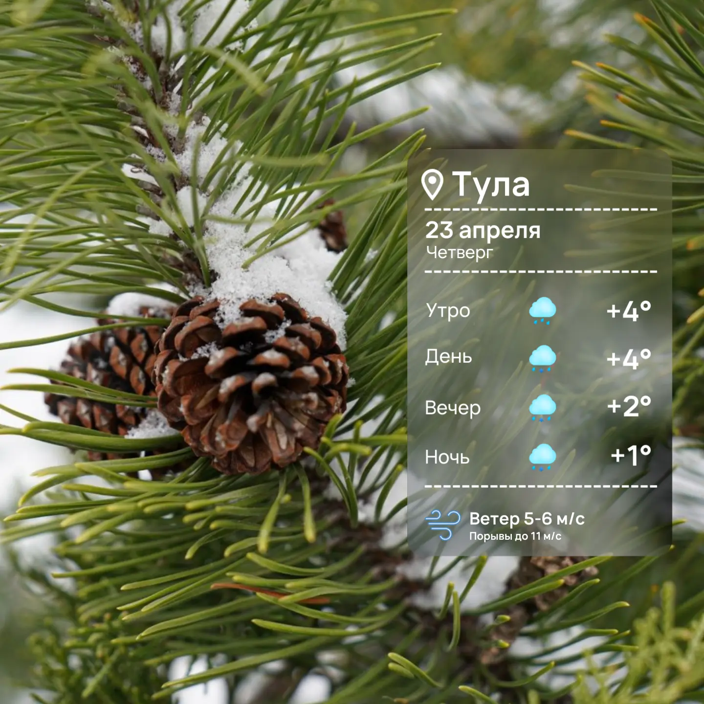 Погода на 23 апреля Время рассвета: 05:10.Время заката: 19:45.Световой день: 14 ч. 35 мин.Температура воздуха: +6°С (днем), +2°C (ночью).Пасмурно, на протяжении дня ожидается дождь.Геомагнитная обстановка: спокойная.Подписаться на ТСН24 | Прислать новость