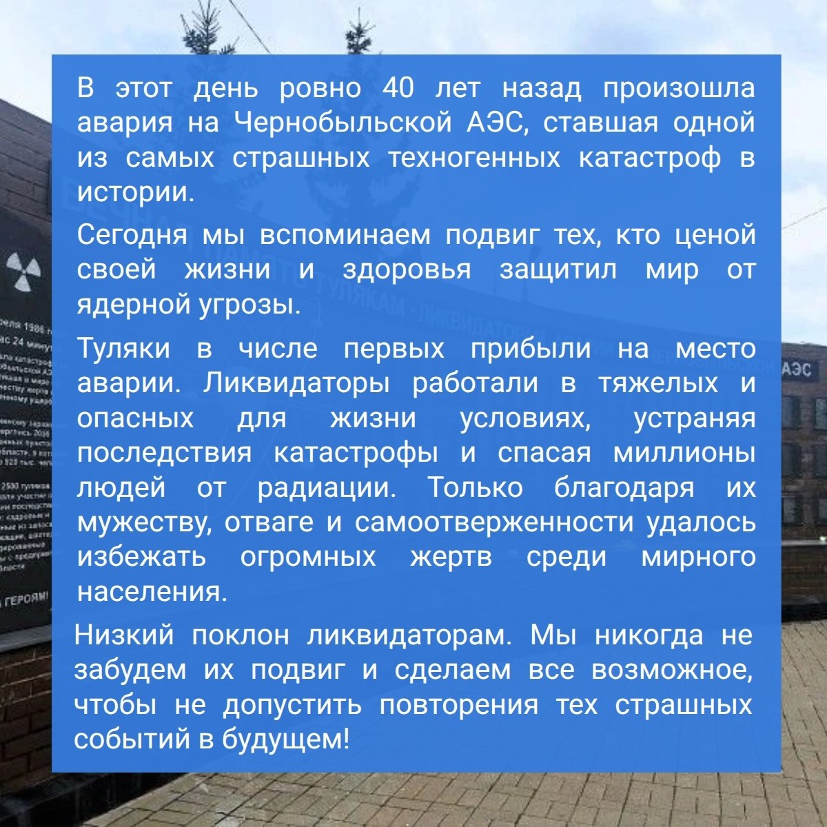 В этот день ровно 40 лет назад произошла авария на Чернобыльской АЭС, ставшая одной из самых страшных техногенных катастроф в истории.Сегодня мы вспоминаем подвиг тех, кто ценой своей жизни и здоровья защитил мир от ядерной угрозы.Туляки в числе...